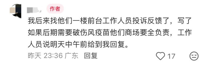 该网友在评论区中留言表示粤有钱,事发当天晚上,其已前往商场一楼前台进行投诉反馈,除了告知工作人员厕所铁片划伤自己的情况,还明确提出“若后期需要注射破伤风疫苗,相关费用需由商场承担”的诉求,工作人员表示会在11月17日对此事作出正式答复。